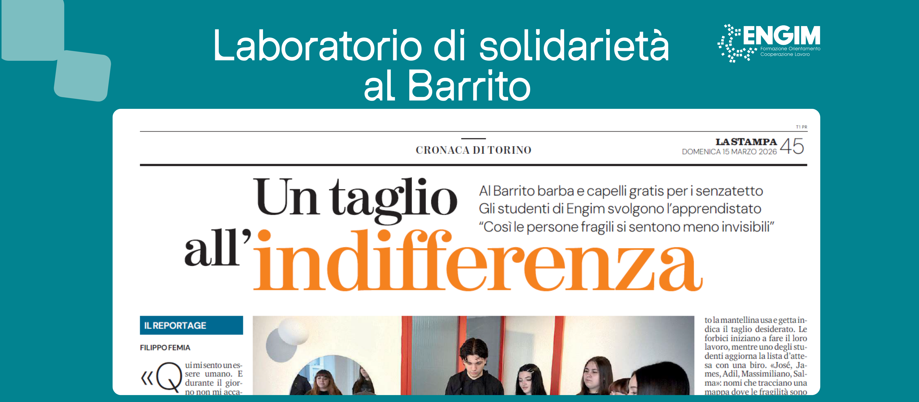 Da quasi tre anni, studentesse e studenti del corso Acconciatura della nostra sede ENGIM San Luca, ogni lunedì si recano all Barrito, la Casa del quartiere di Nizza Millefonti, dove si cimentano nel servizio parrucchiere offerto gratuitamente agli utenti dei bagni pubblici.